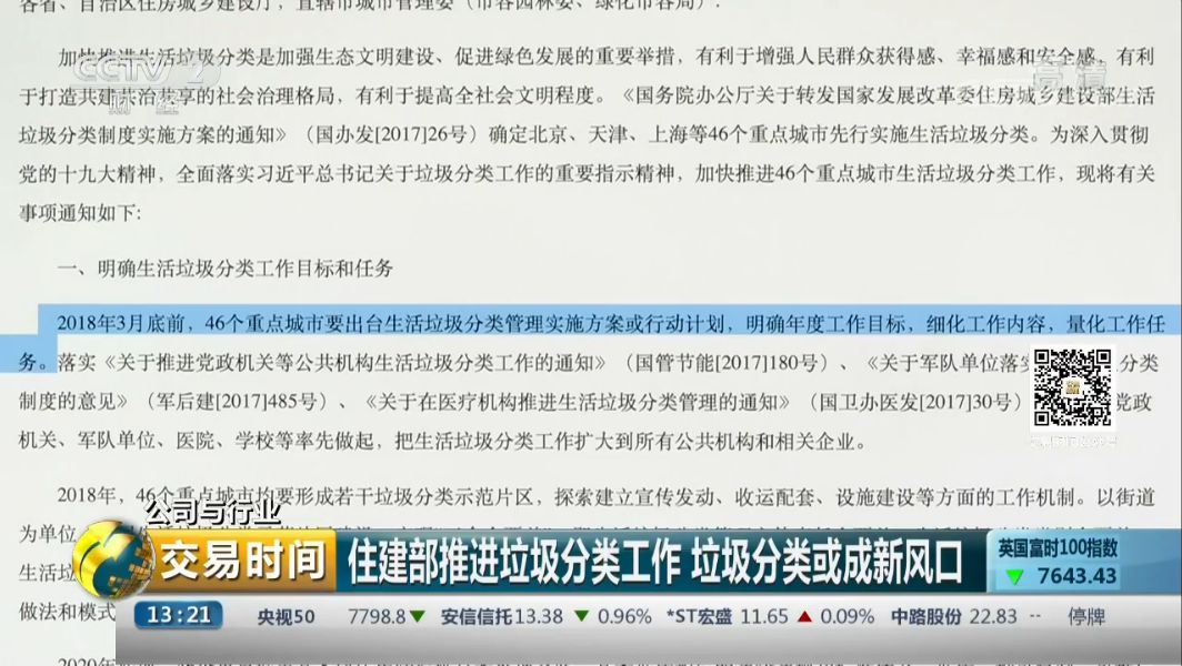 隨著2017年成為環(huán)保政策爆發(fā)年之后,環(huán)保板塊活躍度一度攀升,其中2017年7月18日至10月13日,節(jié)能環(huán)保指數(shù)上漲17.09%,跑贏同期上證綜指10.35個(gè)百分點(diǎn)。2017年底,住建部發(fā)文要求加快推進(jìn)46個(gè)重點(diǎn)城市的垃圾分類(lèi)工作。那么垃圾的分類(lèi)回收、處理會(huì)給企業(yè)帶來(lái)哪些新的商機(jī)呢?來(lái)源:央視交易...