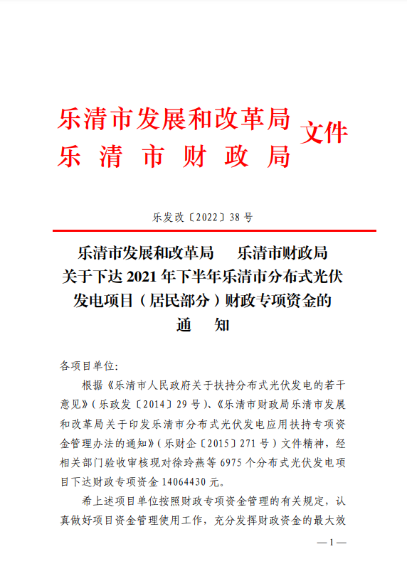 近日,浙江省樂(lè)清市發(fā)展和改革局發(fā)布《關(guān)于下達(dá)2021年下半年樂(lè)清市分布式光伏發(fā)電項(xiàng)目(居民部分)財(cái)政專(zhuān)項(xiàng)資金的通知》。詳情如下: 各項(xiàng)目單位: 根據(jù)《樂(lè)清市人民政府關(guān)于扶持分布式光伏發(fā)電的若干意見(jiàn)》(樂(lè)政發(fā)〔2014〕29號(hào))、《樂(lè)清市財(cái)政局樂(lè)清市發(fā)展和改革局關(guān)于印發(fā)樂(lè)清市分布式光伏發(fā)電應(yīng)用扶持專(zhuān)項(xiàng)...
