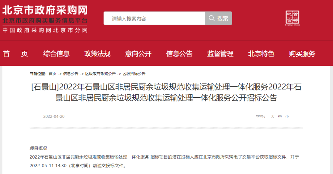 4月20日,北京市政府采購網(wǎng)發(fā)布2022年石景山區(qū)非居民廚余垃圾規(guī)范收集運輸處理一體化服務項目的招標公告,該項目預算金額2500萬元(不含供應商向餐飲單位收取的相關費用)。項目最高限價收運服務費487.29元/噸(含稅),處置服務費331.37元/噸(含稅),收、處合計達818.66元/噸,服務期限...