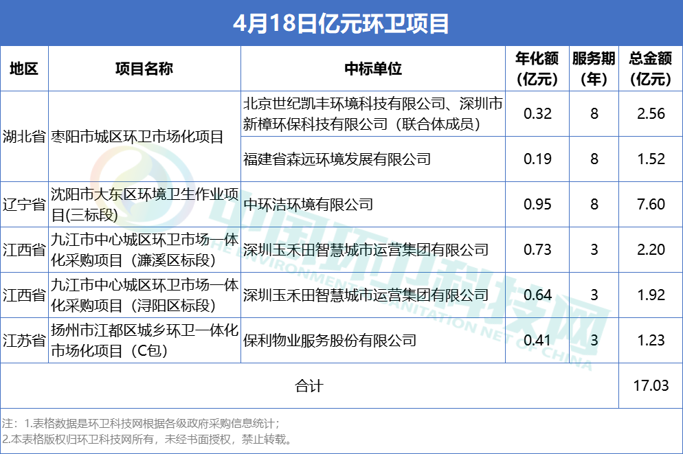 4月18日,有4個億元環(huán)衛(wèi)項目6個標段在同日公布中標結果,合計中標金額達17.03億元,中標單位包括中環(huán)潔、玉禾田、保利物業(yè)、世紀凱豐、新樟環(huán)保和森遠環(huán)境。 沈陽市大東區(qū)環(huán)境衛(wèi)生作業(yè)項目(三標段) 中標單位:中環(huán)潔環(huán)境有限公司; 中標金額:9501.4148萬元/年; 服務期限:5+3模式,實行考核...