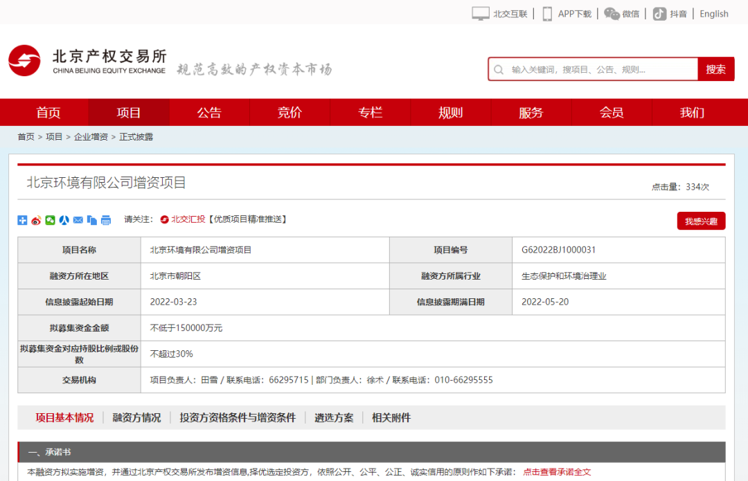 北京環(huán)境有限公司擬引入新的投資方,募集資金金額將不低于15億元人民幣,對應持股比例不超過30%。此次融資要求意向投資方必須以自有資金入股,且注冊資本不低于10億元人民幣。 來源 | 環(huán)衛(wèi)科技網(wǎng)作者 | ivy 環(huán)衛(wèi)科技網(wǎng)從北京產(chǎn)權交易所網(wǎng)站獲悉,北京環(huán)境有限公司(以下簡稱“北京環(huán)境”)擬引入新的投資...