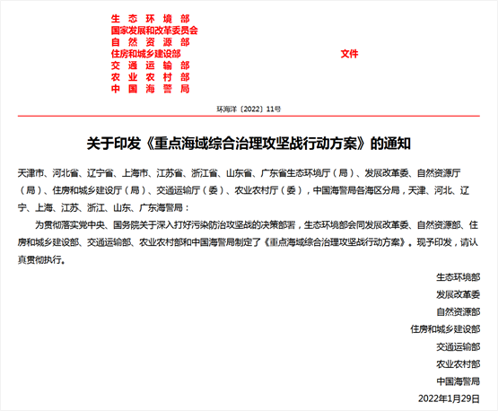 近日,生態(tài)環(huán)境部、發(fā)展改革委、自然資源部、住房和城鄉(xiāng)建設(shè)部、交通運(yùn)輸部、農(nóng)業(yè)農(nóng)村部和中國海警局聯(lián)合印發(fā)《重點(diǎn)海域綜合治理攻堅戰(zhàn)行動方案》(以下簡稱《行動方案》),對“十四五”時期渤海、長江口-杭州灣和珠江口鄰近海域等三大重點(diǎn)海域綜合治理攻堅行動的總體要求、主要目標(biāo)、重點(diǎn)任務(wù)和保障措施等作出了部署安排...