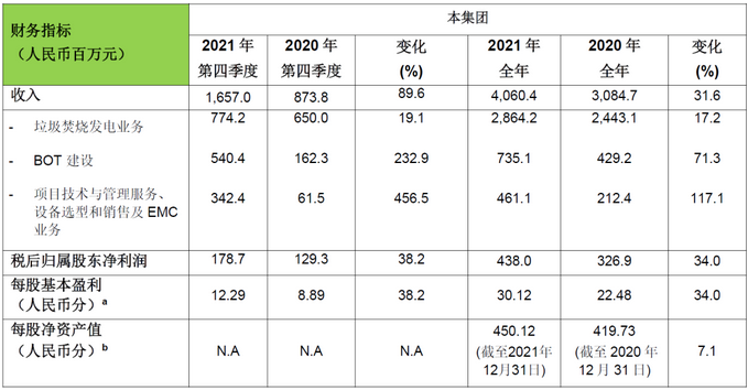 浙能錦江環(huán)境公布2021年全年業(yè)績,2021年全年收入同比增加31.6%至人民幣40.6億元,垃圾焚燒發(fā)電收入同比增長17.2%,稅后歸屬股東凈利潤同比增長34.0%至人民幣4.4億元。 a)2021年第四季度和全年以及2020年第四季度和全年,每股盈利是根據(jù)加權平均股數(shù)來計算的。b)2021年12...