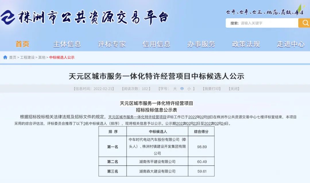 2月21日,株洲市公共資源交易平臺(tái)發(fā)布天元區(qū)城市服務(wù)一體化特許經(jīng)營(yíng)項(xiàng)目的中標(biāo)候選人公示。中車時(shí)代電動(dòng)汽車股份有限公司(牽頭人)、株洲村鎮(zhèn)建設(shè)開發(fā)集團(tuán)有限公司以98.89分的綜合得分奪得第一名。 來(lái)源 |環(huán)衛(wèi)科技網(wǎng)作者 | 王應(yīng)心 又一央企闖入城服市場(chǎng)! 2月21日,株洲市公共資源交易平臺(tái)發(fā)布天元區(qū)城...