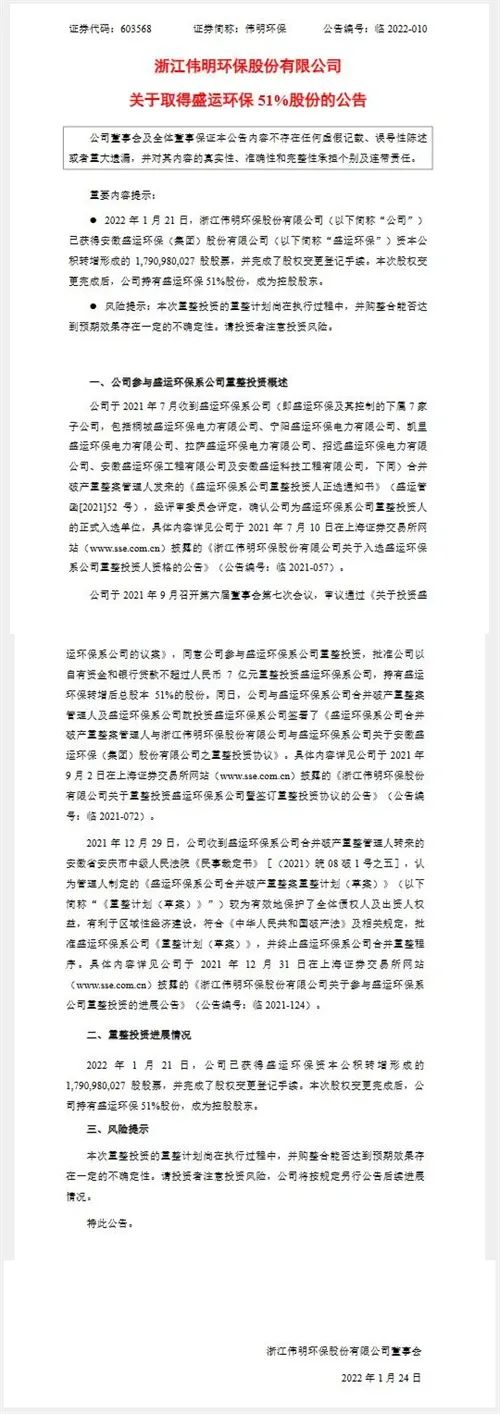 日前,偉明環(huán)保發(fā)布公告,該公司已獲得安徽盛運(yùn)環(huán)保(集團(tuán))股份有限公司(以下簡(jiǎn)稱“盛運(yùn)環(huán)?!?資本公積轉(zhuǎn)增形成的17.91億股股票,并完成了股權(quán)變更登記手續(xù)。 2022年1月21日,浙江偉明環(huán)保股份有限公司獲得安徽盛運(yùn)環(huán)保(集團(tuán))股份有限公司(以下簡(jiǎn)稱“盛運(yùn)環(huán)保”)資本公積轉(zhuǎn)增形成的逾17.9億股股票...