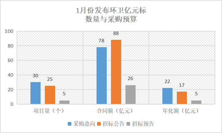 環(huán)境司南監(jiān)測(cè)數(shù)據(jù)顯示,截止1月29日,1月份全國(guó)共發(fā)布環(huán)衛(wèi)“億元標(biāo)”60個(gè),采購(gòu)預(yù)算約192億元(年化額約43億元)。 環(huán)境司南監(jiān)測(cè)數(shù)據(jù)顯示,截止1月29日,1月份全國(guó)共發(fā)布環(huán)衛(wèi)“億元標(biāo)”60個(gè),采購(gòu)預(yù)算約192億元(年化額約43億元)。 區(qū)域分布 1月份已發(fā)布的60個(gè)環(huán)衛(wèi)億元標(biāo)分布于23個(gè)省份,其...