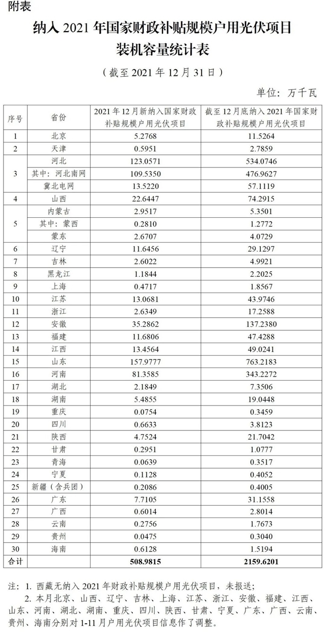按照《國(guó)家能源局關(guān)于2021年風(fēng)電、光伏發(fā)電開發(fā)建設(shè)有關(guān)事項(xiàng)的通知》(國(guó)能發(fā)新能〔2021〕25號(hào))和《國(guó)家能源局綜合司關(guān)于2019年戶用光伏項(xiàng)目信息公布和報(bào)送有關(guān)事項(xiàng)的通知》(國(guó)能綜通新能〔2019〕45號(hào))關(guān)于戶用光伏項(xiàng)目管理有關(guān)要求,全國(guó)共有30個(gè)省份報(bào)送了戶用光伏項(xiàng)目信息(西藏?zé)o納入2021...
