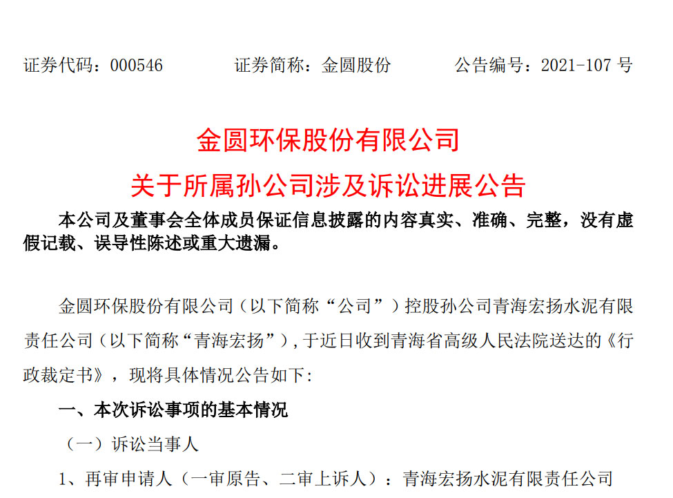 因?yàn)?萬元的環(huán)保處罰,導(dǎo)致3655萬元稅收優(yōu)惠沒有了,是不是有點(diǎn)因小失大?2021年12月29日,金圓環(huán)保股份有限公司(下稱“金圓股份”)發(fā)布公告,宣布了一起所屬孫公司青海宏揚(yáng)水泥有限責(zé)任公司(下稱“青海宏揚(yáng)”)涉及訴訟的進(jìn)展,青海宏揚(yáng)要求確認(rèn)環(huán)保處罰無效的再審申請被法院駁回。這意味著,經(jīng)歷了一審、...