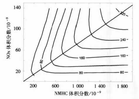EKMA曲線示意圖。來源:劉通浩論文《中國電力行業(yè) NOX排放控制成本效益分析》