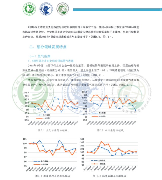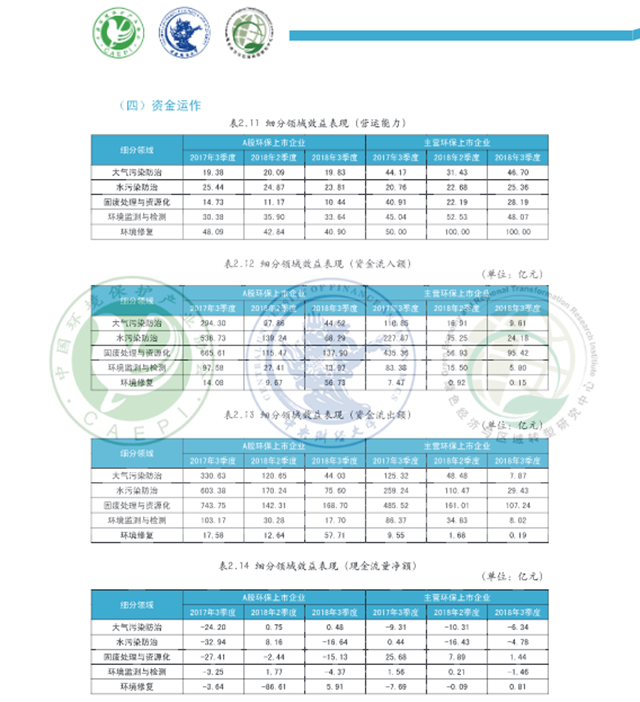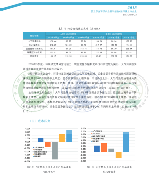 從細分領(lǐng)域看,A股環(huán)保上市企業(yè)2018年3季度各領(lǐng)域景氣表現(xiàn)呈現(xiàn)不同程度的回暖,主營環(huán)保上市企業(yè)在大氣污染防治、水污染防治、環(huán)境監(jiān)測和檢測三領(lǐng)域景氣表現(xiàn)回升。固廢處理與資源化領(lǐng)域規(guī)模較2017年同期有所擴大, A股環(huán)保上市企業(yè)稅負壓力同比大幅增加,成本壓力較去年同期明顯減輕,預計該領(lǐng)域下季度景氣有望上行:大氣污染防治領(lǐng)域資金外流和國款情況較2017年同期有所改善,預計該領(lǐng)域A股環(huán)保上市企業(yè)下季度景氣表現(xiàn)下滑,主營環(huán)保上市企業(yè)下季度景氣有望上行:環(huán)境監(jiān)測與檢測領(lǐng)域規(guī)模較上季度呈擴張態(tài)勢, 效益表現(xiàn)總體優(yōu)于上季度,下季度該領(lǐng)域景氣表現(xiàn)有望上行:環(huán)境修復領(lǐng)域營運能力、現(xiàn)金流量凈額和流動性表現(xiàn)相對較好,A股環(huán)保上市企業(yè)稅負壓力較去年同期大幅下降,主營環(huán)保上市企業(yè)稅負壓力快速攀升,預計下季度A股環(huán)保上市企業(yè)景氣表現(xiàn)小幅上行,主營環(huán)保上市企業(yè)景氣或?qū)⑾禄核廴痉乐晤I(lǐng)域利潤總額、流動性不及去年同期和上季度,A股環(huán)保上市企業(yè)成本壓力較去年同期有所減輕,主營環(huán)保上市企業(yè)稅負壓力同比小幅減輕,預計該領(lǐng)域下季度景氣表現(xiàn)下行。