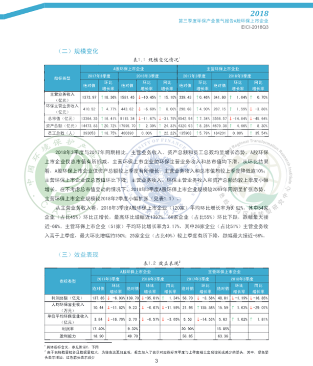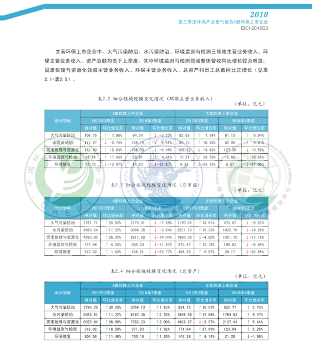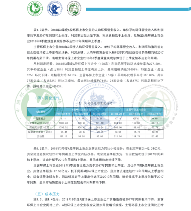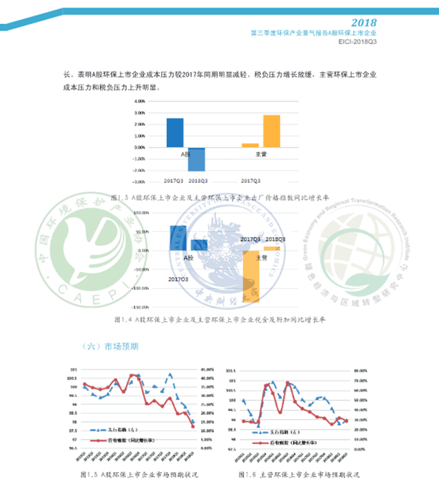 2018年3季度,從主營業(yè)務收入、環(huán)保主營業(yè)務收入、資產(chǎn)總額和員工總數(shù)看,A股環(huán)保上市企業(yè)規(guī)模較2017年同期呈現(xiàn)擴張態(tài)勢,主營環(huán)保上市企業(yè)規(guī)模較上季度小幅擴張:效益表現(xiàn)總體不及去年同期:資金流逆差情況較2017年同期和上季度有所改善, 回款情況好于上季度:A股環(huán)保上市企業(yè)成本壓力較2017年同期明顯減輕、稅負壓力增長放緩,主營環(huán)保上市企業(yè)成本壓力和稅負壓力上升較為明顯:預期A股環(huán)保上市企業(yè)2018年4季度市場表現(xiàn)可能欠佳,主營環(huán)保上市企業(yè)下季度市場表現(xiàn)或?qū)⑴c本季度持平。