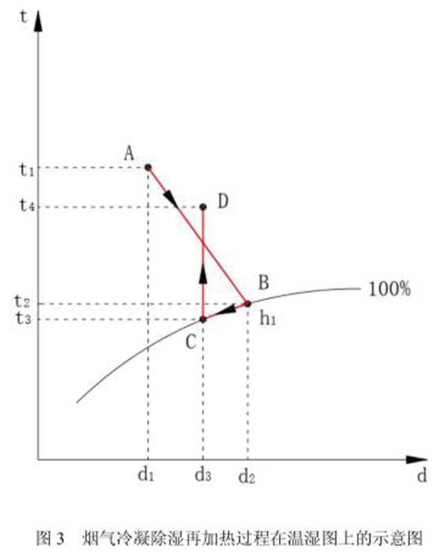 這是一個等焓增濕的過程。采用直接或間接的方式對飽和狀態(tài)B的煙氣進行冷卻,部分汽態(tài)水釋放氣化潛熱發(fā)生相變而凝結(jié)為液態(tài)水,順著等100%的相對濕度線從B點處理到C點,煙氣仍為相對濕度100%的飽和煙氣,但絕對濕度降低為d2-d3,煙氣中的水蒸氣含量降低。