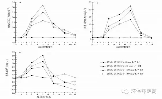 圖 7進(jìn)水C(SO42-)對UASB反應(yīng)咯呆全內(nèi)NO2--N、NO3--N、S2-指標(biāo)隨反應(yīng)時間變動的影響