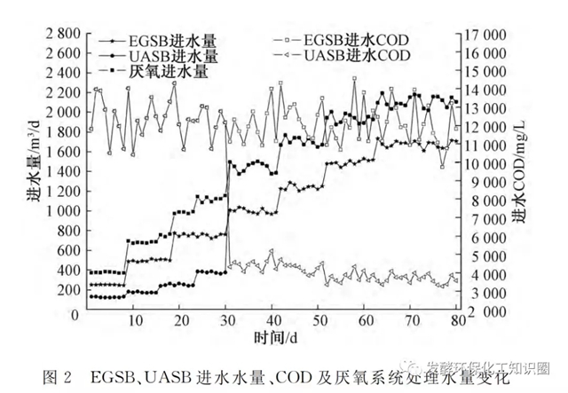 EGSB及UASB采用同類檸檬酸生產(chǎn)廠家厭氧顆粒污泥啟動,EGSB和UASB投加的含水率94%的顆粒污泥量分別是600m3和300m3,占各自反應(yīng)器容積的45%和30%。EGSB、UASB進水水量、COD及厭氧系統(tǒng)處理水量變化見圖2。