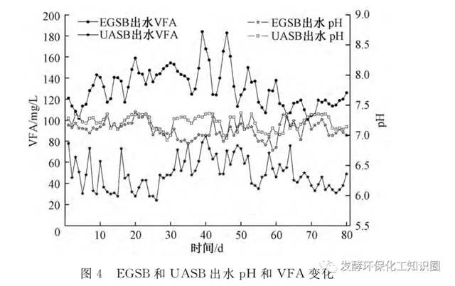 EGSB出水的VFA濃度在130±60mg/L;而UASB出水的VFA在50±25mg/L,UASB出水VFA低于EGSB出水VFA50%。上述EGSB和UASB的PH是適合甲烷菌生長的,反應(yīng)器也沒有VFA的積累。同時UASB出水的VFA比EGSB出水的VFA低,也說明UASB中有機物降解的更加徹底。