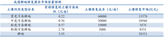 土壤問題具有隱蔽性,輿論媒體關(guān)注低。與大氣污染和水污染不同,土壤污染的表現(xiàn)形式相對隱蔽。部分土壤污染物從肉眼上并不容易辨別,而部分受污染的土壤又遠離人們的聚居區(qū),因此導(dǎo)致土壤污染相對難以得到重視。土壤市場仍未完全釋放,但潛在市場巨大,預(yù)計十三五期間將引來第一波土壤修復(fù)高潮,市場潛力在3000億左右。