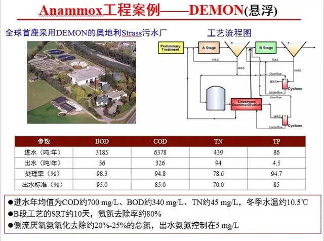 奧地利Strass污水處理廠是全球首座采用DEMON的污水廠。污泥消化液的厭氧氨氧化主要有兩個方面的核心技術(shù):一是基于pH的DO實(shí)時控制短程硝化,另一個是基于物理分離技術(shù)實(shí)現(xiàn)雙泥齡,采用旋流分離器(DEMON1.0),后改進(jìn)為微篩選擇器(DEMON2.0)。Strass污水廠目前在厭氧氨氧化做的非常成功,氨氮去除率約80%,總氮去除率20%-25%,出水氨氮控制在5mg/L以下。目前這種工藝在美國、德國、瑞士等也都做的非常好。