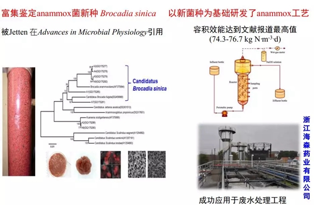 鄭平教授團(tuán)隊改進(jìn)的Anammox工藝容積效能達(dá)到文獻(xiàn)報道最高值(74.3~76.7kg N·m-3·d),并成功應(yīng)用于浙江的海森藥業(yè)有限公司廢水處理工程,這是中國第一個厭氧氨氧化廢水處理的實(shí)際工程。