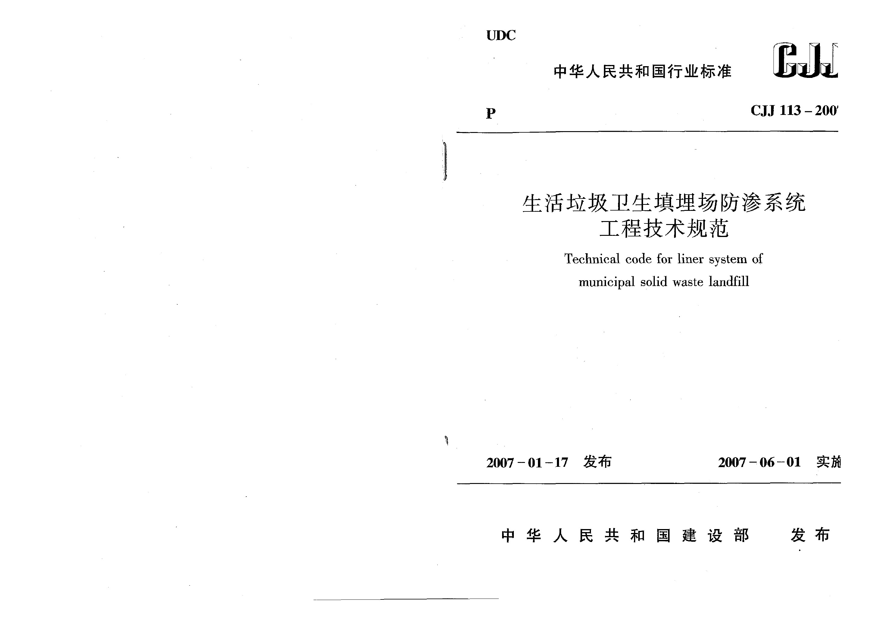 生活垃圾衛(wèi)生填埋場(chǎng)防滲系統(tǒng)工程技術(shù)規(guī)范(CJJ 113-2007)