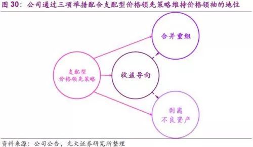 價(jià)格領(lǐng)袖是指經(jīng)由同業(yè)的龍頭公司現(xiàn)行制定產(chǎn)品某一期間內(nèi)的價(jià)格后,其它公司根據(jù)制定的價(jià)格,就其同質(zhì)產(chǎn)品確定其價(jià)格。行業(yè)的競(jìng)爭(zhēng)對(duì)手如果期望維持已有的市場(chǎng)份額,只能與領(lǐng)先公司制定的價(jià)格相匹配。WM在通過兼并收購(gòu)占據(jù)統(tǒng)治性的市場(chǎng)份額后,利用龍頭地位果斷選擇了支配型價(jià)格領(lǐng)先策略,進(jìn)一步通過“收益導(dǎo)向策略”、“合并重組”、“剝離不良資產(chǎn)”這三項(xiàng)舉措的實(shí)施維持其價(jià)格領(lǐng)袖的地位。