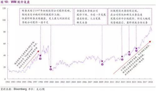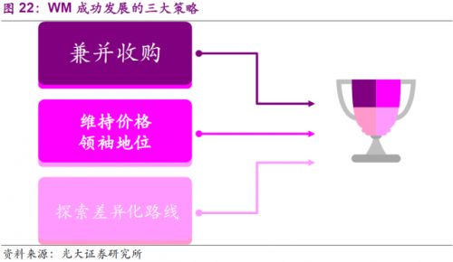 縱觀WM發(fā)展的歷史,它既享受到外部經(jīng)濟(jì)和行業(yè)高速發(fā)展所帶來的廣闊市場(chǎng),也需經(jīng)歷經(jīng)濟(jì)危機(jī)和市場(chǎng)轉(zhuǎn)型所帶來的陣痛。公司為搶占市場(chǎng)份額,穩(wěn)固龍頭地位,實(shí)現(xiàn)股東最大化方面做出了多方面努力,制定了各類執(zhí)行策略以期達(dá)到目標(biāo),而我們認(rèn)為其中最重要的是三項(xiàng)策略,也是我們將進(jìn)一步細(xì)致分析的,即兼并收購(gòu),維持價(jià)格領(lǐng)袖地位,以及探索差異化路線。