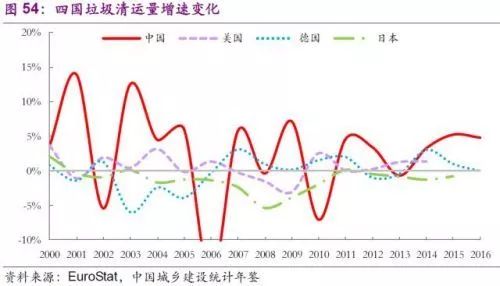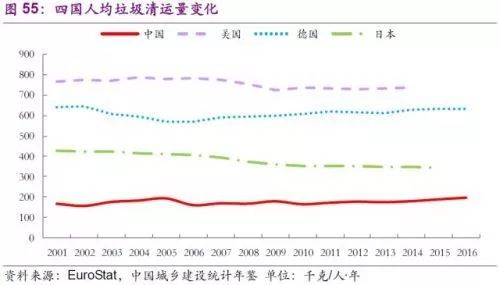 美國(guó)、日本、德國(guó)同為全球領(lǐng)先的發(fā)達(dá)國(guó)家,早在二十世紀(jì)90年代便實(shí)現(xiàn)了100%垃圾清運(yùn)率,所以它們的垃圾產(chǎn)生量也是他們的垃圾清運(yùn)量。美國(guó)垃圾清運(yùn)量從二十世紀(jì)90年代起仍在持續(xù)增長(zhǎng),目前維持在2.3億噸左右;德國(guó)垃圾清運(yùn)量偶有波動(dòng),基本維持在5千萬(wàn)噸;日本垃圾清運(yùn)量更是從1990年的5千萬(wàn)噸減少到2015年的4千萬(wàn)噸左右。中國(guó)垃圾清運(yùn)量伴隨著經(jīng)濟(jì)高速發(fā)展,在2001年起計(jì)入縣城垃圾清運(yùn)量后達(dá)到2億噸水平,總量和美國(guó)持平并在2012年實(shí)現(xiàn)超越,成為全球垃圾清運(yùn)第一大國(guó)。