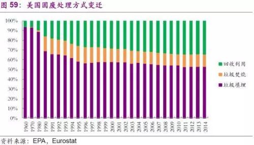 美國(guó)在經(jīng)歷了1980—2000年期間大規(guī)模的“去填埋化”后,近年來固廢處理方式較為穩(wěn)定,填埋仍是其主流處理方式,2014年占比近53%,垃圾焚燒和回收利用占比分別為13%和34%。由于垃圾焚燒有著處理成本較高,領(lǐng)避效應(yīng)等不利因素,該處理方式恐較難在美國(guó)進(jìn)一步發(fā)展。回收利用目前雖因分揀環(huán)節(jié)成本較高,導(dǎo)致近年來在美國(guó)的發(fā)展速度有所放緩,但是我們認(rèn)為,隨著垃圾分類觀念的進(jìn)一步普及,和龍頭企業(yè)市場(chǎng)化力度的進(jìn)一步加大,美國(guó)回收利用處理占比有望進(jìn)一步提升。