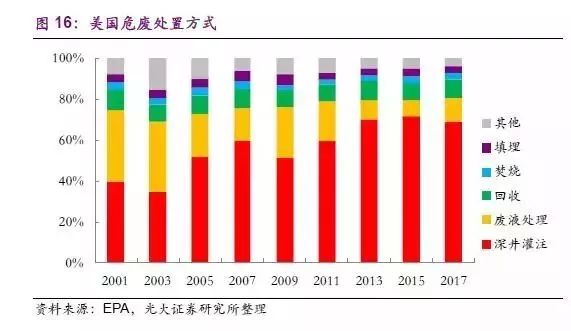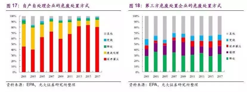 (3)危廢處置方式求同存異。整體來看,美國(guó)危廢處置方式的選擇已基本統(tǒng)一,深井灌注已成為美國(guó)危廢處置的主流方式,自2013年深井灌注處置危廢量的占比穩(wěn)定在70%左右,廢液處理(僅適用于液費(fèi))、能量回收、焚燒、填埋位列2-5 位。但是另一方面,第三方處置和自產(chǎn)自處理的危廢處置方式有著較大的不同。石油、化工等大型企業(yè)多使用深井灌注處理自己產(chǎn)出的危廢(占比達(dá)80%以上),因其處置手段安全且成本相對(duì)較低;而第三方處置企業(yè)的主流處置方式則是回收利用(包括能量、金屬、溶劑等,占比近30%),填埋、焚燒、深井灌注等處置方式的占比均在10%左右。處置方式差異化的主要原因是自產(chǎn)自處理企業(yè)多為石油和化工企業(yè),危廢種類多為液費(fèi),深井灌注具有顯著的成本優(yōu)勢(shì);而第三方處置企業(yè)接收的危廢種類更加多樣化,液費(fèi)占比也相對(duì)較低(30%左右),回收、焚燒、填埋等處置方式更符合其成本控制和利益獲取的要求,所以上述處置方式的占比更多。