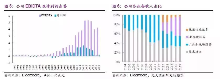 除傳統(tǒng)的技術(shù)服務(wù)之外,公司還提供SK環(huán)境及性能產(chǎn)品服務(wù)、工業(yè)和現(xiàn)場(chǎng)服務(wù)、以及能源領(lǐng)域(石油天然氣和住宿)服務(wù)三大業(yè)務(wù),努力向“一站式服務(wù)”的服務(wù)提供商靠攏。其中,前兩種業(yè)務(wù)和傳統(tǒng)的技術(shù)服務(wù)共同構(gòu)成了公司的核心增長(zhǎng)動(dòng)力,三者營(yíng)業(yè)收入占比高達(dá)96%;而能源領(lǐng)域服務(wù)在未來有望隨著美國(guó)頁(yè)巖氣革命的發(fā)展給公司帶來新的增量。