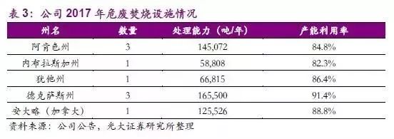 危廢焚燒方面,公司擁有北美共13個(gè)商業(yè)危險(xiǎn)廢物焚化爐中的9個(gè),是北美這類設(shè)施的最大運(yùn)營(yíng)商。公司垃圾焚燒實(shí)際處理能力為561,721噸,2017年的平均使用率為87.6%。
