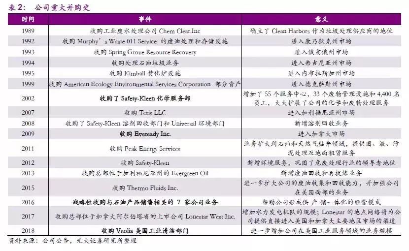 公司上在原有危廢處理技術(shù)的基礎(chǔ)上,通過兼并收購(gòu)增添一系列新的服務(wù)領(lǐng)域。2008年,公司通過收購(gòu)Safety-Kleen 溶劑回收部門和Universal 環(huán)境部門,開始涉足溶劑回收市場(chǎng),新增大量業(yè)務(wù)。2009年,公司收購(gòu)Eveready,在進(jìn)軍加拿大市場(chǎng)的同時(shí),擴(kuò)大了公司能源和工業(yè)服務(wù)范圍。能源和工業(yè)部門為石油和天然氣勘探和生產(chǎn),煉油,石化,紙漿和造紙以及電力公用事業(yè)終端市場(chǎng)等提供一系列服務(wù)。此前,Clean Harbors 在這一領(lǐng)域的傳統(tǒng)業(yè)務(wù)相對(duì)較小,收購(gòu)Eveready 將公司的能源和工業(yè)服務(wù)收入從3千萬增加到5.5~6億,使其從一個(gè)小眾玩家成長(zhǎng)為了市場(chǎng)上該項(xiàng)業(yè)務(wù)強(qiáng)有力的競(jìng)爭(zhēng)對(duì)手。2011年,公司收購(gòu) Peak Energy Services,提供固、液、污泥處理及地面租賃服務(wù),將業(yè)務(wù)擴(kuò)大到石油和天然氣鉆井領(lǐng)域。2012年,公司收購(gòu)北美領(lǐng)先的廢油回收和再精煉、零件清潔及環(huán)境解決方案公司Safety-Kleen,是公司歷史上最大規(guī)模收購(gòu)。對(duì)Safety-Kleen的并購(gòu)使得公司成為北美最大的二手油重磨機(jī)和回收商。此次收購(gòu)新增了環(huán)境服務(wù)業(yè)務(wù),進(jìn)一步鞏固了公司危廢處理行業(yè)的領(lǐng)導(dǎo)者地位。公司在2013年和2015年相繼收購(gòu)了總部位于加利福尼亞州的Evergreen Oil 及 Thermo Fluids Inc.,提升公司廢油回收和再精煉能力,進(jìn)一步增強(qiáng)業(yè)務(wù)能力。
