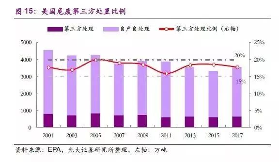 (2)第三方處理比例較低。在1990年后,政府對(duì)危廢的監(jiān)管進(jìn)一步趨嚴(yán),單純的通過第三方處置對(duì)于有大量危廢產(chǎn)出的企業(yè)來說成本過高,加上危廢處理技術(shù)的進(jìn)一步成熟,促使眾多大型化工企業(yè)采用自行處理危廢的方式消納危廢產(chǎn)出。從2001年起,美國(guó)危廢的場(chǎng)外處理量(Waste received fromoff-Site,即接收從場(chǎng)外運(yùn)送進(jìn)處理廠內(nèi)的危廢,基本等同于第三方處置量)穩(wěn)定在15%到20%之間,在危廢產(chǎn)量基本穩(wěn)定的情況下,第三方處置危廢企業(yè)可以分到的蛋糕其實(shí)十分有限,這也激發(fā)了危廢處置企業(yè)開拓新業(yè)務(wù)的需求。
