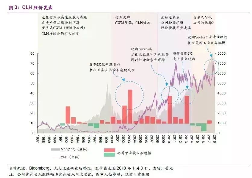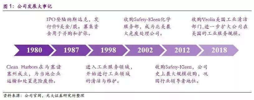 公司于1980年在馬薩諸塞州成立,1989年通過收購(gòu)工業(yè)廢水處理公司Chem Clear Inc. 確立了CLH 作為垃圾處理供應(yīng)商的地位。1992-1995年,公司先后收購(gòu)Murphys Waste 011 Service 的廢油處理和存儲(chǔ)設(shè)施、SpringGrove Resource Recovery、處理石油垃圾業(yè)務(wù)、Kimball 焚化爐設(shè)施,逐步進(jìn)入康乃狄克州市場(chǎng)、俄亥俄州市場(chǎng)、弗吉尼亞州市場(chǎng)、內(nèi)布拉斯加州市場(chǎng),將公司從東海岸發(fā)展到中部。1999年和2007年,公司先后收購(gòu)AmericanEcology Environmental Services Corporation 部分資產(chǎn)、Teris LLC,進(jìn)入德克薩斯州市場(chǎng)及加利福尼亞市場(chǎng),將業(yè)務(wù)拓展到西部。2009年,公司收購(gòu)從事工業(yè)維護(hù)和生產(chǎn)、住宿和地震服務(wù)的加拿大公司Eveready,此次收購(gòu)增加了2,100多名員工,79個(gè)地點(diǎn)和2400多輛卡車和拖車單元的服務(wù)車隊(duì),將業(yè)務(wù)拓展到加拿大,公司正式進(jìn)軍海外市場(chǎng)。此外,公司2002年收購(gòu) Safety-Kleen化學(xué)服務(wù)部,為公司增加了 55個(gè)服務(wù)中心、33個(gè)廢物管理設(shè)施、4400名員工,大大擴(kuò)展了公司的化學(xué)和廢物處理服務(wù),提升了核心競(jìng)爭(zhēng)力。