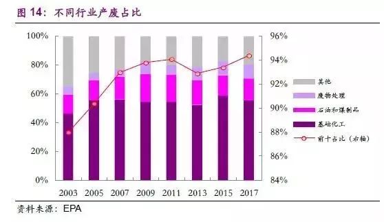 (1)危廢行業(yè)較依賴工業(yè),尤其是化工和油氣行業(yè)的發(fā)展。美國(guó)不同行業(yè)對(duì)危廢產(chǎn)量的貢獻(xiàn)度上,基礎(chǔ)化工制造業(yè)占比常年超50%,石油和煤制品制造業(yè)以及廢物處理行業(yè)也穩(wěn)居前三,且近20年來,排名前三和前十的行業(yè)的危廢產(chǎn)量占比在穩(wěn)步提高,進(jìn)一步推動(dòng)了行業(yè)集中度的提升。