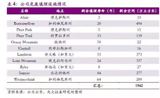 危廢填埋方面,公司在美國(guó)和加拿大共擁有11個(gè)活躍的垃圾填埋場(chǎng),其中兩個(gè)是非商業(yè)垃圾填埋場(chǎng),他們只接受來自公司焚化爐的垃圾。其余9個(gè)均為商業(yè)用垃圾填埋場(chǎng),7個(gè)允許用于處置危險(xiǎn)廢物,另2個(gè)用于非處置危險(xiǎn)工業(yè)垃圾處理和城市固體垃圾處理。目前,這些商用垃圾填埋場(chǎng)的仍有約1942萬立方米的剩余容量。