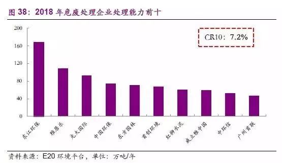 目前我國(guó)危廢市場(chǎng)的優(yōu)秀參與者眾多,隨著危廢處理“量?jī)r(jià)齊增”的情況延續(xù),從傳統(tǒng)危廢處理企業(yè)東江環(huán)保、光大綠色環(huán)保,到全產(chǎn)業(yè)鏈拓展的大型環(huán)保公司東方園林、北控水務(wù),再到資金實(shí)力雄厚的新興力量海螺創(chuàng)業(yè)、雅居樂,均在危廢行業(yè)持續(xù)開疆拓土。但是,我國(guó)的危廢市場(chǎng)行業(yè)集中度仍相對(duì)較低。根據(jù)E20環(huán)境平臺(tái)的統(tǒng)計(jì),雖然我國(guó)的危廢企業(yè)處理量快速增長(zhǎng),但是CR10的總產(chǎn)能僅占全國(guó)總產(chǎn)能的7.2%,仍有大量的危廢產(chǎn)能被小型企業(yè)所瓜分。