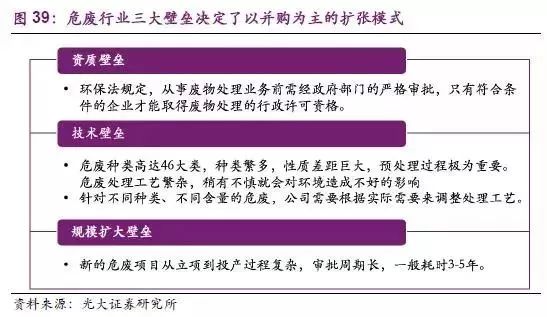 規(guī)模擴(kuò)大壁壘:新的危廢項(xiàng)目從立項(xiàng)到投產(chǎn)過程復(fù)雜,審批周期長(zhǎng),一般耗時(shí)3-5年。顯然,收購(gòu)有資質(zhì)的企業(yè)會(huì)比新建產(chǎn)能更容易擴(kuò)大企業(yè)規(guī)模。