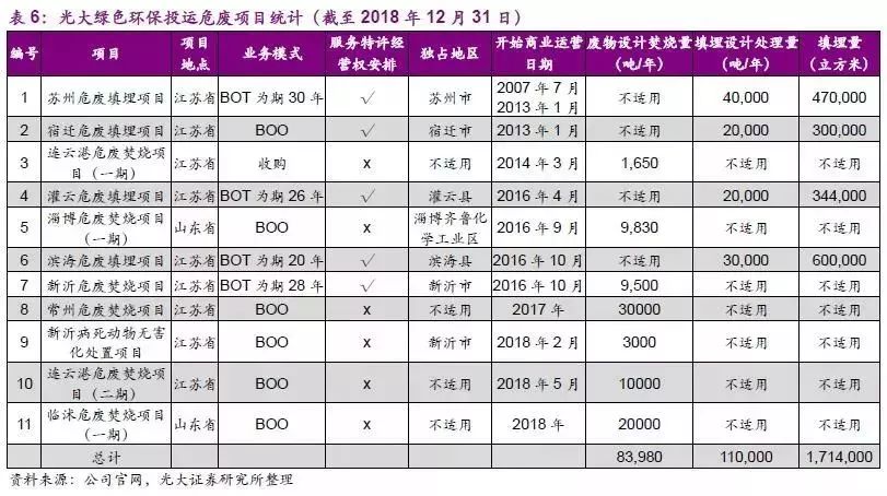 截止2018年12月31日,綠色環(huán)保共擁有58個(gè)生物質(zhì)綜合利用項(xiàng)目(運(yùn)營(yíng)22個(gè)、在建14個(gè)、籌建13個(gè)、未啟動(dòng)二期項(xiàng)目9個(gè))、32個(gè)危廢綜合處理項(xiàng)目(運(yùn)營(yíng)11個(gè)、在建4個(gè)、籌建17個(gè))、7個(gè)光伏發(fā)電項(xiàng)目和2個(gè)風(fēng)電項(xiàng)目(均已投運(yùn))、以及9個(gè)環(huán)境修復(fù)項(xiàng)目(運(yùn)營(yíng)1個(gè)、在建7個(gè)、籌建1個(gè)),總投資共約240億元,年生活垃圾處理產(chǎn)能102萬噸,年危廢處理產(chǎn)能19.4萬噸(焚燒8.4、填埋11),年供熱量96萬噸。