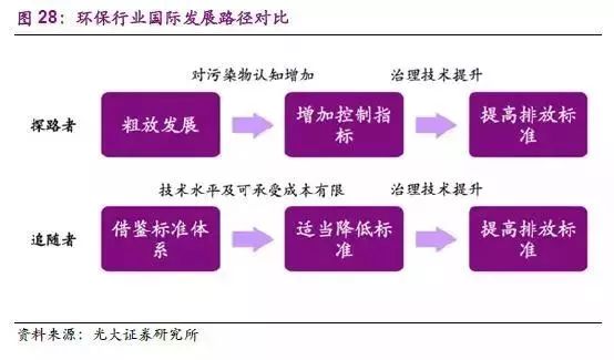 以美國(guó)為首的發(fā)達(dá)國(guó)家的環(huán)保意識(shí)隨著工業(yè)的大力發(fā)展率先覺醒,開始針對(duì)工業(yè)污染物制定相關(guān)標(biāo)準(zhǔn)。隨著對(duì)污染物的認(rèn)知上升,行業(yè)標(biāo)準(zhǔn)趨于嚴(yán)格,技術(shù)規(guī)范性也逐步提高。到二十世紀(jì)90年代,發(fā)達(dá)國(guó)家的探路者之旅已經(jīng)基本形成。以中國(guó)為代表的發(fā)展中國(guó)家雖然在環(huán)保行業(yè)起步較晚,但卻有一整套行業(yè)標(biāo)準(zhǔn)和技術(shù)規(guī)范可以借鑒,扮演著追隨者的角色。