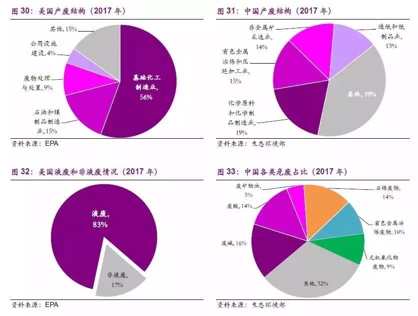 從產(chǎn)廢結(jié)構(gòu)上來看,美國(guó)是石油化工生產(chǎn)大國(guó),其產(chǎn)廢結(jié)構(gòu)中基礎(chǔ)化工以及石油/煤制品制造業(yè)的產(chǎn)廢占比合計(jì)高達(dá)71%(2017年);由于石化企業(yè)多產(chǎn)生液態(tài)危廢,因而美國(guó)的危廢產(chǎn)量中83%為液態(tài)危廢。而我國(guó)的化工行業(yè)產(chǎn)廢僅占總量的19%,且產(chǎn)廢行業(yè)較為分散,有色金屬冶煉、非金屬礦采選、造紙等行業(yè)的產(chǎn)廢占比均超過10%。另一方面,液態(tài)危廢在國(guó)內(nèi)危廢總體結(jié)構(gòu)中占比較小,以目前的廢物結(jié)構(gòu)看,將廢堿(15.67%)、廢酸(14.37%)、廢油(5.36%)全看作液態(tài)危廢,合計(jì)占比僅為35%。