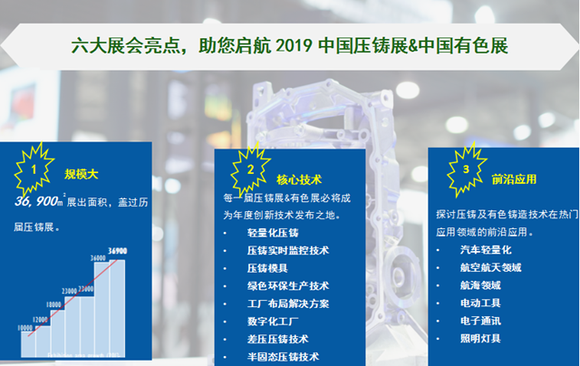 中國(guó)壓鑄展和中國(guó)有色展力爭(zhēng)走在行業(yè)前沿,通過(guò)展品及現(xiàn)場(chǎng)10多場(chǎng)專題論壇,發(fā)布并展示壓鑄生產(chǎn)工藝中,具有創(chuàng)新性、行業(yè)關(guān)注的熱點(diǎn)解決方案:結(jié)構(gòu)件壓鑄技術(shù)、綠色環(huán)保生產(chǎn)技術(shù)、智能制造方案、數(shù)字化工廠、數(shù)控機(jī)床、半固態(tài)壓鑄技術(shù)、鎂合金鑄件技術(shù)等話題,優(yōu)化工藝流程,提高能源利用效率。