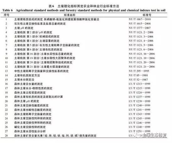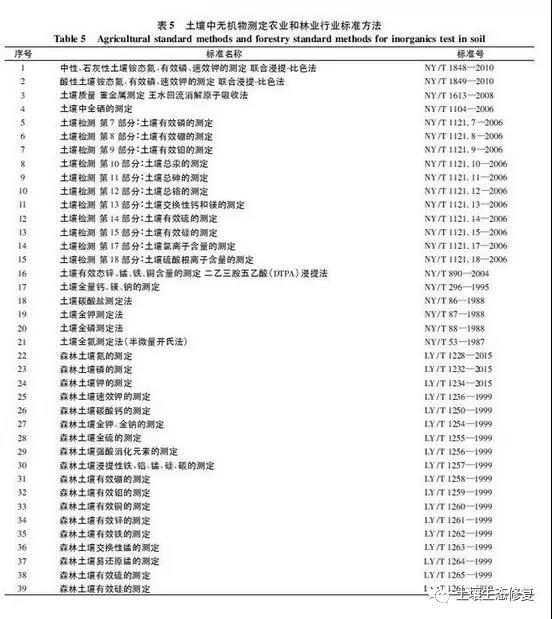 8個理化指標(biāo)等方法中,涉及5個測定指標(biāo)(電導(dǎo)率、氧化還原電位、有機碳、可交換酸度、干物質(zhì)和水分等),以及5種測定方法(電極法、滴定法、重量法、分光光度法和非分散紅外法等)。另外,農(nóng)業(yè)、林業(yè)也有土壤檢測標(biāo)準(zhǔn)方法,主要側(cè)重于土壤營養(yǎng)元素及其有效態(tài)、理化指標(biāo)的檢測,詳見表5和表6。農(nóng)業(yè)行業(yè)標(biāo)準(zhǔn)方法中,有21個涉及無機元素及其有效態(tài)測定的方法,有15個涉及土壤理化指標(biāo)的方法;林業(yè)行業(yè)標(biāo)準(zhǔn)方法針對的是森林土壤,有15個涉及無機元素及其有效態(tài)測定的方法,有13個涉及土壤理化指標(biāo)的方法。