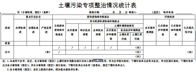 (三)嚴格執(zhí)行登記制度。各區(qū)要按照方案要求,按時完成各項工作,于6月30日前向市環(huán)保局報送土壤質(zhì)量與修復(fù)規(guī)劃;7月15日前向市環(huán)保局報送各類登記表(附件1);11月30日前向市環(huán)保局報送各類花名冊(附件2)和土壤污染專項整治情況統(tǒng)計表(附件3)。同時向市市容園林委報送涉及城鎮(zhèn)生活垃圾相關(guān)內(nèi)容,向市農(nóng)委報送涉及村莊內(nèi)生活垃圾相關(guān)內(nèi)容。