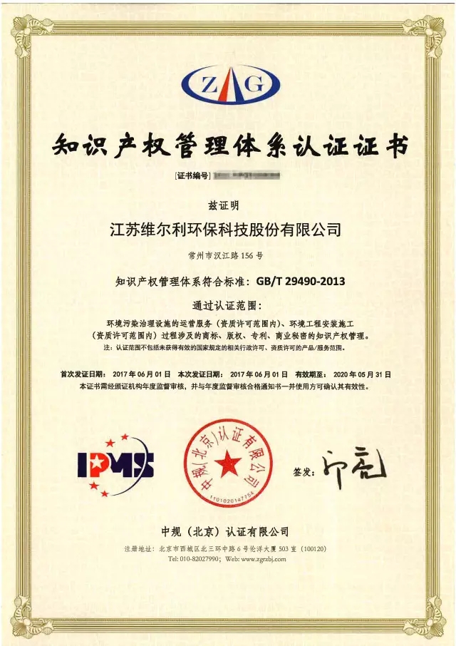 2017年6月,江蘇維爾利環(huán)??萍脊煞萦邢薰卷樌ㄟ^(guò)認(rèn)證,獲得GB/T29490-2013知識(shí)產(chǎn)權(quán)管理體系認(rèn)證證書(shū)。