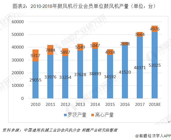 根據(jù)中國通用機(jī)械工業(yè)協(xié)會(huì)風(fēng)機(jī)分會(huì)統(tǒng)計(jì),2017年,協(xié)會(huì)會(huì)員單位羅茨鼓風(fēng)機(jī)產(chǎn)量為48371臺(tái),同比增長16.5%;協(xié)會(huì)會(huì)員單位離心鼓風(fēng)機(jī)產(chǎn)量為3664臺(tái),同比增長35.8%。據(jù)測算,2018年,協(xié)會(huì)會(huì)員單位鼓風(fēng)機(jī)產(chǎn)量合計(jì)達(dá)到5.7萬臺(tái),同比增長9.54%。