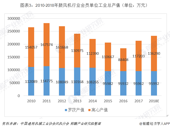 2017年,鼓風(fēng)機(jī)行業(yè)協(xié)會(huì)會(huì)員單位離心鼓風(fēng)機(jī)產(chǎn)值117203萬元,比上年增長32.6%;羅茨鼓風(fēng)機(jī)產(chǎn)值95962萬元,比上年增長25.6%。據(jù)測算,2018年,協(xié)會(huì)會(huì)員單位鼓風(fēng)產(chǎn)值合計(jì)達(dá)到232282萬元,同比回升8.97%。