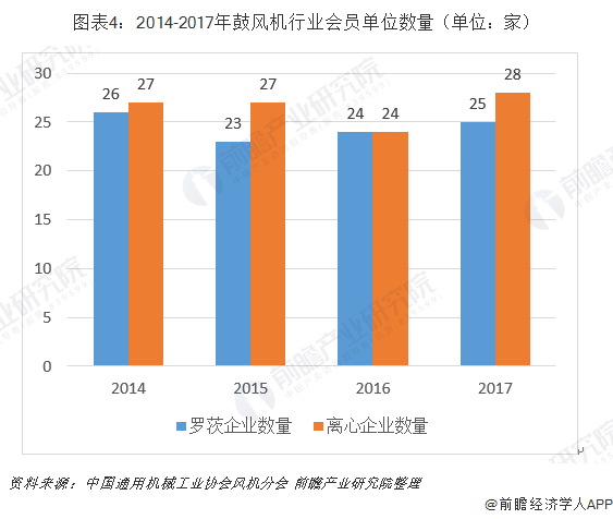 根據(jù)中國通用機(jī)械工業(yè)協(xié)會(huì)風(fēng)機(jī)分會(huì)統(tǒng)計(jì),截至2017年底,協(xié)會(huì)會(huì)員單位生產(chǎn)離心鼓風(fēng)機(jī)的企業(yè)有28家,比上年增加4家;生產(chǎn)羅茨鼓風(fēng)機(jī)的企業(yè)有25家。