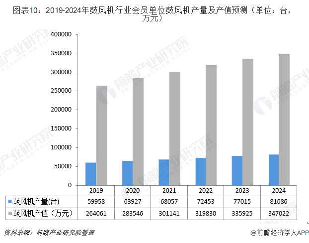 未來,國內(nèi)分布式能源、垃圾發(fā)電、污水處理、大氣污染治理行業(yè)的持續(xù)推進(jìn),將進(jìn)一步刺激鼓風(fēng)機(jī)行業(yè)的需求。同時(shí)競爭態(tài)勢看,國內(nèi)鼓風(fēng)機(jī)企業(yè)與國外優(yōu)秀鼓風(fēng)機(jī)品牌在技術(shù)上的差距在逐漸縮小,未來國內(nèi)鼓風(fēng)機(jī)企業(yè)將進(jìn)一步占據(jù)國內(nèi)鼓風(fēng)機(jī)市場份額?;谝陨蟽牲c(diǎn)考量,前瞻認(rèn)為,鼓風(fēng)機(jī)市場仍有較大的發(fā)展空間,預(yù)計(jì)到2024年,會(huì)員單位鼓風(fēng)機(jī)產(chǎn)量將突破8萬臺(tái),會(huì)員單位鼓風(fēng)機(jī)產(chǎn)值將突破34億元。