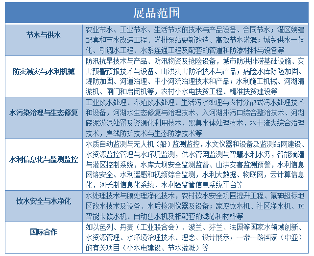水環(huán)境治理技術的升級,必然帶來涉水行業(yè)服務模式的升級,傳統的商業(yè)模式已不能滿足新命題。在此背景下,水博會作為行業(yè)年度盛會,特別將此次輻射網延伸至節(jié)水與供水、防災減災與水利機械、水污染治理與生態(tài)修復、水利信息化與監(jiān)測監(jiān)控、飲水安全與水凈化、國際合作六大領域。具體如下圖所示: