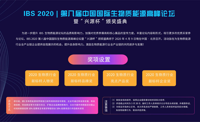 為進(jìn)一步提升IBS生物質(zhì)能源論壇的品質(zhì)和影響力,加強(qiáng)對(duì)優(yōu)質(zhì)參展商和核心展品的宣傳力度,豐富論壇內(nèi)容和形式,吸引更多的優(yōu)質(zhì)買家參與論壇,IBS 2020第八屆中國國際生物質(zhì)能源高峰論壇暨“興源杯”頒獎(jiǎng)盛典將于2020年4月9日晚在中國·北京召開。整個(gè)會(huì)議現(xiàn)場(chǎng)將攜手諸多國內(nèi)外知名媒體進(jìn)行全程跟蹤報(bào)道及宣傳,為生物質(zhì)能源行業(yè)全產(chǎn)業(yè)鏈企業(yè)提供自我展示的機(jī)會(huì),更好的樹立公信力和品牌影響力塑造。